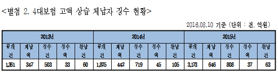 지난해 산업재해 은폐, 고액 상습체납자, 기타징수금 결손처리 등으로 인한 건강보험 재정 누수가 총 3307억9200만원에 이르는 것으로 나타났다. 산업재해 은폐 등으로 인한 산재 부당수급 환수결정액은 878억6100만원이었다. 또 고액 상습체납자 체납액, 기타징수금 결손처리는 각각 609억원, 1820억3100만원을 기록했다.