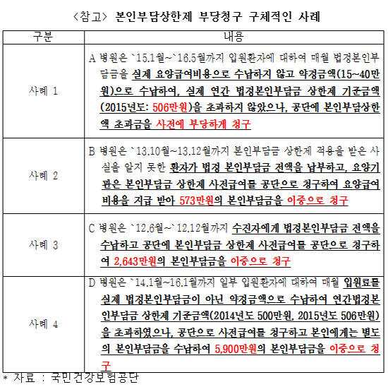 또 의료기관과 환자가 공모해 건보공단으로부터 더 많은 초과상한액을 돌려받을 수 있도록 과잉진료하거나 총 진료비를 부풀려 환자에게는 본인부담금을 불법으로 할인해주는 부당사례도 한 몫하고 있다.