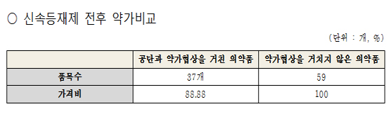권 의원은 "대개 대체약제가 존재하는 신약은 약가협상을 통해 약제급여평가위원회를 거친 가격보다 낮은 가격에 등재된다. 실제 약가협상을 거친 신약은 급여적정 평가값 대비 평균 11.12% 인하된 것으로 파악된다"고 말했다.
