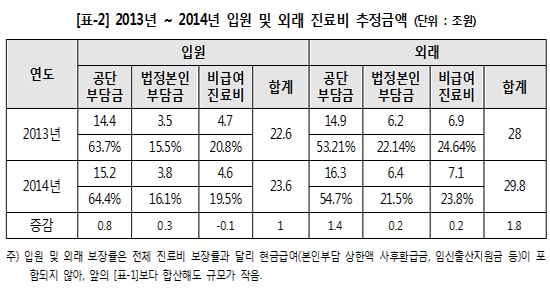 전체 의료비 상승을 주도한 것은 외래 진료였고, 개인 의료비 부담이 늘어난 것은 입원진료인 것으로 나타났다. 입원과 외래의 진료비 규모는 2014년 입원 23조6000억원, 외래는 29조8000억원이었다. 2013년 대비해서는 입원은 1조원이 늘어났으나, 외래는 1조8000억원이 늘어났다.