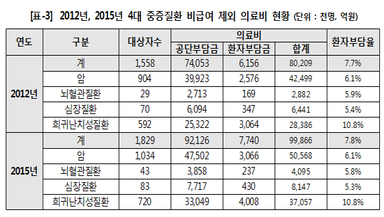 특히 4대 중증질환의 경우 2012년 환자의 법정본인부담금이 6156억원이었지만, 2015년에는 7740억원으로 증가했다. 물론 환자수가 155만8000명에서 182만9000명으로 늘어나기는 했지만, 정부가 4대 중증질환 비급여 항목을 건강보험 항목으로 계속 늘려왔다는 점에서 효과는 미비하다고 평가할 수 있다고 했다.