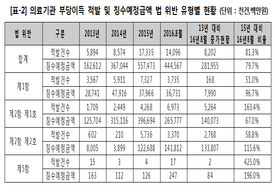 특히 의료기관을 개설할 자격이 없음에도 불구하고 병원이나 의원을 개설해 부당이득을 얻은 경우가 급격하게 증가해 주목된다. 적발건수는 2013년에 비해 526만 건 증가했고, 부당이득도 1400억원이 늘었다. 지난해와 비교해도 적발 건수는 163.4%가 증가했다. 의료기관을 개설할 자격이 없는 사람이 의료인을 내세워 병원을 설립하는 속칭 사무장병원의 증가가 원인으로 판단된다고 윤 의원은 지적했다.