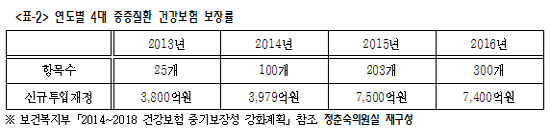 보건복지부는 '4대중증질환 보장성 강화 정책'을 세워 2013년부터 2014년까지 총 125개 항목에 신규 재정만 약 8000억원을 투입했으나, 결과적으로 4대중증질환 보장성 강화에는 큰 도움이 되지 못했다는 지적이다.
