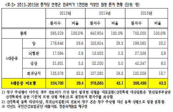 국민건강보험공단에서 제출한 자료를 보면, 2015년 기준으로 환자당 진료비가 연평균 1000만원 이상인 질병의 환자 70만8200명 중 4대중증질환에 포함되지 않는 환자는 43.3%인 30만6496명이나 됐다.