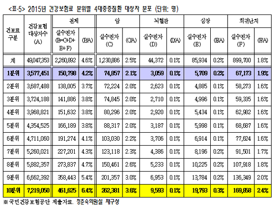이 같은 양상은 암질환(2.1% vs 3.6%), 심장질환(0.2% vs 0.3%), 희귀난치성질환(1.9% vs 2.4%) 등에서도 유사하게 나타났다. 결국 4대중증질환 보장성 강화정책 혜택이 저소득층보다는 고소득층에게 더 많이 돌아간 것이다.