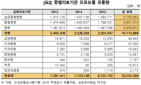 의원급 의료기관에서 유통되는 프로포폴은 일반의가 210만여개로 가장 많았고 내과 205만여개, 성형외과 78만여개로 집계됐다.
