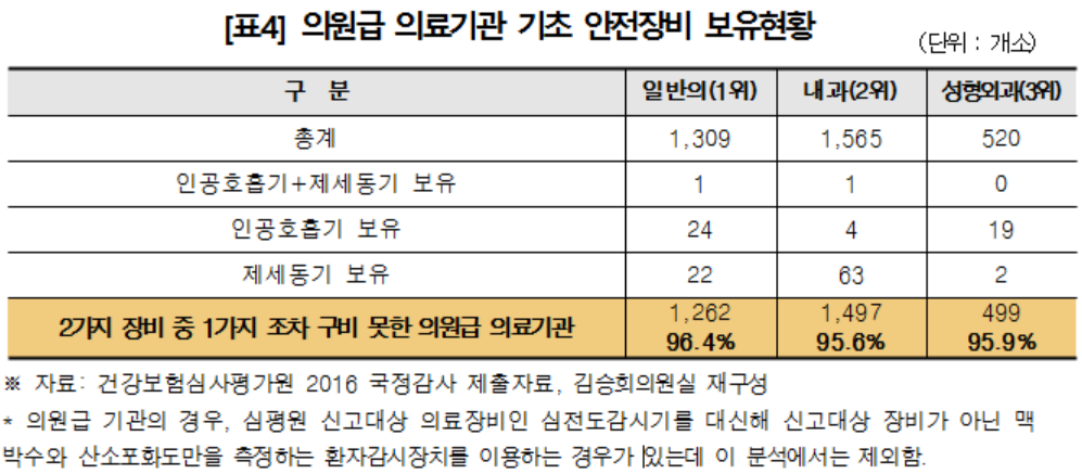 20일 새누리당 김승희 의원은 "프로포폴 사용 의원급 의료기관에서 인공호흡기, 제세동기 등 환자안전용 필수 의료기기 장비를 구비하지 않은 곳은 95%에 달했다"고 밝혔다.
