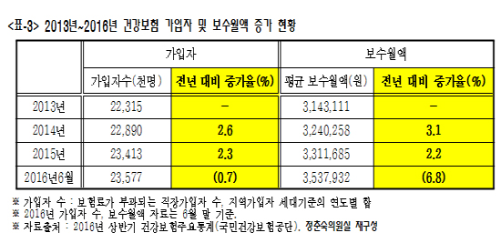 실제 건강보험 가입자는 2014년 2.6%(+57만5000명), 2015년 2.3%(+52만3000명) 각각 증가했고, 건강보험 가입자 평균 보수월액도 2014년 3.1%(+9만7147원), 2015년 2.2%(+7만1427원) 늘었는데 아예 빼버렸다.