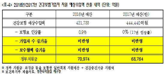 복지부는 상황이 이런데도 개선의지를 보이지 않고 있다는 비판도 내놨다. 국회에 제출한 2017년도 예산안에도 이들 요소를 예상수입액 산출에 반영하지 않은 것이다. 오히려 복지부는 예상수입액이 증가했는데도 정부지원액을 삭감하기도 했다.
