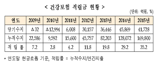 건강보험 적립금은 2000~2010년 흑자와 적자를 반복해 9592억원까지 줄었다가 2011년 이후 당기수지 흑자가 지속되면서 지난해 말 기준 16조9800억원까지 증가했다. 연간 지출대비 적립률은 35.2%다.