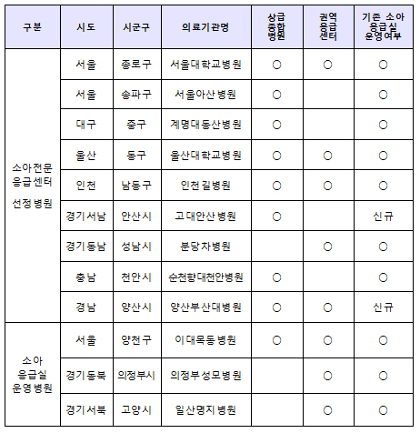 이를 통해 9개 기관이 소아전문응급센터로 선정됐고, 시설공사와 인력확충을 거쳐 내년 하반기부터 소아전문응급센터로 운영될 예정이다. 소아전문응급센터로 선정되지 않은 기존 소아응급실 3개소를 포함하면 총 12개 기관이 소아응급실을 운영하게 된다.
