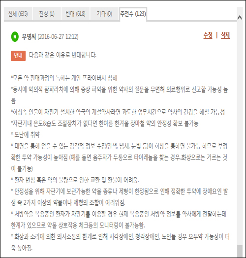 아이디 '2002he****'는 "국민편의성이나 효율성 없는 화상투약기를 위해 법까지 개정한다는 건 말도 안되는 핑계이고, (실상은) 원격진료나 의약품 인터넷 판매등을 허용하기 위한 사전 작업이 아닌 지 의심스럽다"고 했다.