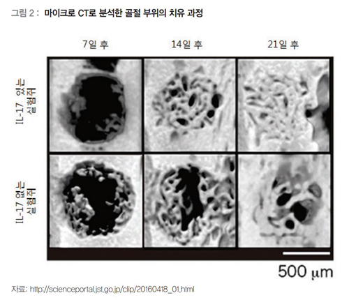 이어 골절치료에 이 단백질이 미치는 영향을 확인하기 위해 IL-17이 있는 쥐와 없는 쥐를 놓고 실험했다. 이 결과 IL-17이 있는 쥐가 없는 쥐보다 골절회복속도가 빠른 것으로 나타났다.