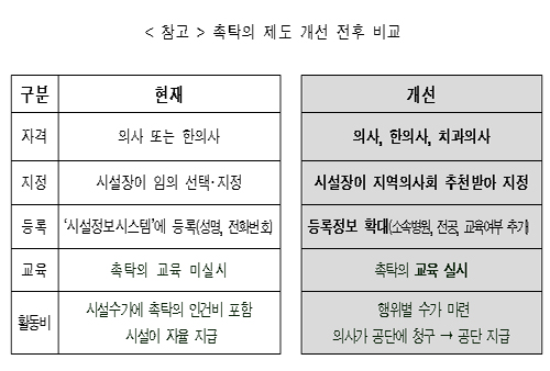 또 촉탁의 지정은 지역의사회의 추천을 통하는 방식으로 개선한다. 그동안에는 촉탁의를 시설장이 선택해 지정했지만, 앞으로는 시설장이 각 직역(의사협회, 한의사협회, 치과의사협회)별 지역의사회에 추천을 요청해 지정한다.