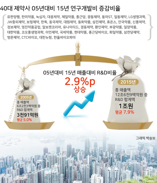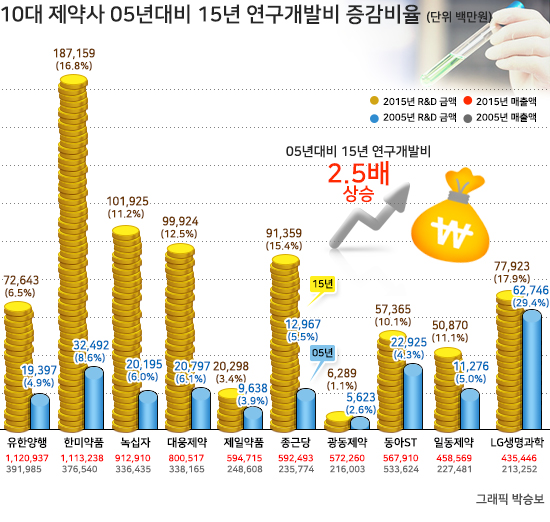 데일리팜의 조사 결과, 상위 10개, 20개 제약은 지난 10년 사이 R&B 투자 비용을 2.5배 넘게 늘렸다.