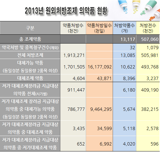 ◆원외처방조제 약품 현황=2013년 전체 처방약품수는 1만3117개, 처방전수는 5억706만건이었다. 이중 처방약품수 32개, 처방전수 107만9000건은 약국처방 및 중복청구건수로 제외시켰다.