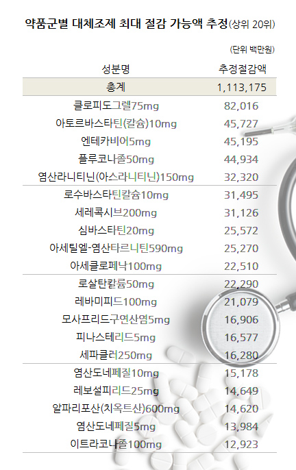 이와 함께 약품군별 추정 가능 절감액이 가장 큰 성분은 동맥경화용제인 클로피도그렐75mg과 아토르바스타틴10mg으로 각각 820억원과 457억원 규모로 나타났다.