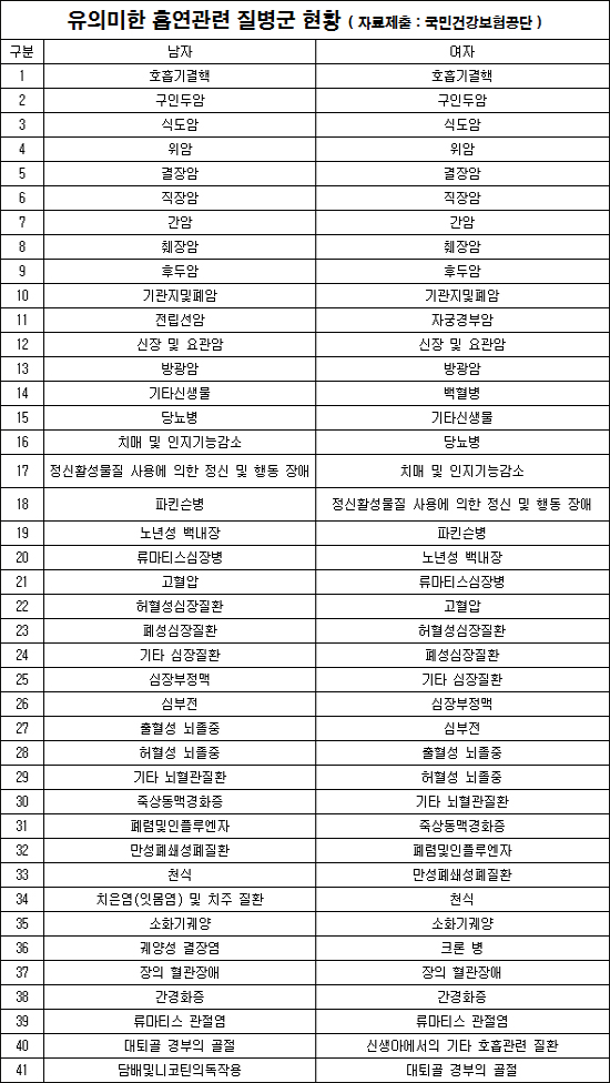 이 같은 사실은 국회 보건복지위원회 소속 더불어민주당 인재근 의원이 건강보험공단으로부터 제출받은 '최근 5년간 주요 흡연관련 질병(44개) 진료비 현황' 자료를 통해 확인됐다.