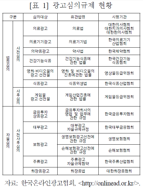 이들은 "사전적 광고심의제도에 대한 헌법재판소의 결정을 고려할 때 향후 광고심의제도에 대한 쟁점은 크게 두 가지로 볼 수 있다"면서 "개별법상 현재 시행되고 있는 광고사전심의제도를 유지할 것인 지, 공적 규제를 대체하는 민간자율심의를 어떤 형태로 유지할 것인 지 등이 그 것"이라고 했다.