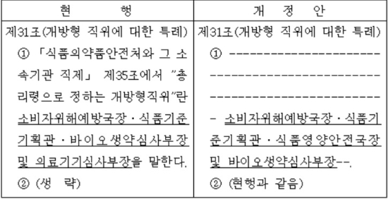 국장급 개방형 직위도 의료기기심사부장에서 식품영양안전국장으로 변경될 것으로 보인다. 식약처 개정안에 의견이 있는 단체나 개인은 오는 14일까지 의견서 양식을 식약처장에 제출하면 된다.