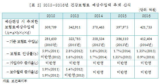 국회예산정책처는 보험료 예상수입액은 전전년도 보험료 수입액에 2개연도 보험료 인상률, 가입자 수 증가율, 보수월액 증가율을 적용해 산출하는데, 내년도 예산안은 보험료 인상률만 반영되고 가입자 수 증가율 등은 반영되지 않는 등 과소 추계 가능성이 높다고 주장했다.