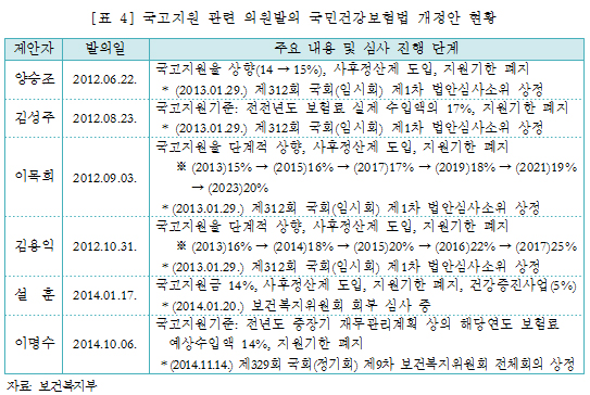 법률은 일반회계 예산 범위에서 건강보험료 예상수입액의 14%를 지원하도록 정하고 있다. 그러나 정부는 예상수입액과 이에 따른 예산규모를 5조 9043억원으로 산출한 뒤, 7040억원 인상분 조정 계수를 사용해 최종 예산안을 5조 2061억원으로 조정했다. 결과적으로 예상수입액 대비 예산안 비율은 12.3%에 불과하다.