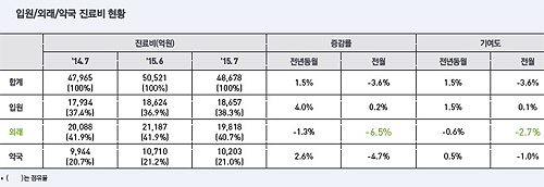 외래 진료비는 6월에 비해 6.5%에 해당하는 1369억원 줄고, 지난해 7월보다는 1.3% 줄었다. 진료비 증감 기여도를 기준삼아 살펴보면 외래와 약국이 각각 2.7%, 1%씩 줄었고, 입원은 0.1% 늘었다.