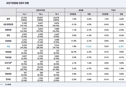 다만 지난해 7월과 비교해볼 때 상급종병과 한의원이 각각 3.1%, 3.2% 줄어든 것을 제외하고는 모두 고르게 늘었다. 특히 치과병원 24.7%, 요양병원 11.8% 늘어 두드러졌다.