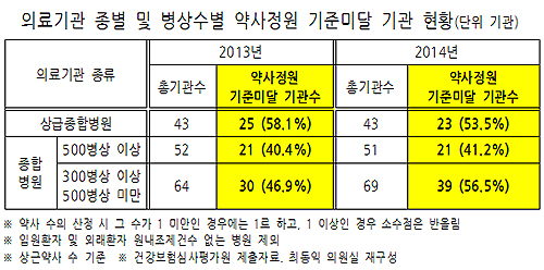 반면 300~500병상 미만 종병 중 약사가 부족한 기관은 2013년 30곳(46.9%)에서 지난해 39곳(56.5%)으로 되려 증가했다.