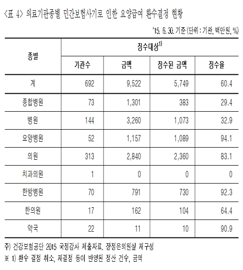 또 의료기관종별 환수결정 현황은 병원 34.2%(114건, 32억 6000만원), 의원 29.8%(313건 28억 4000만원), 종합병원 13.7%(73건 13억원), 요양병원 12.2%(52건 11억 6000만원) 등으로 분포했다.