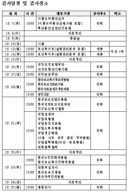 이어 10일 시찰, 13~14일 복지부(질병관리본부, 세종청사), 16일 건보공단과 심평원, 17일 국민연금공단(국회), 20일 보건복지정보개발원·보건의료연구원·의료분쟁조정중재원·증인심문(국회) 등의 순으로 진행한다.