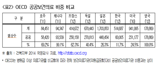 우리나라의 공공의료 비중이 OECD 회원국 중 최하위 수준임에도 불구하고, 박근혜 정부 출범이후에도 지속적으로 하락해 적극적인 대책마련이 필요하다는 주장이 제기됐다.