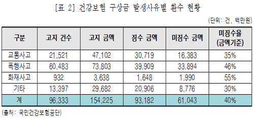 건보 구상금 미징수액 5년간 610억…40% 못 받아