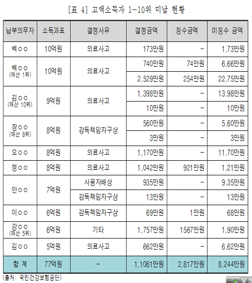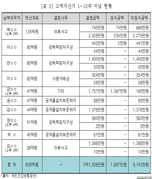실제 구상금 미납자 중 자산이 135억~38억원이나 되는 고액자산가 상위 1~10위 가입자 중 7명이 구상금을 단 한 푼도 납부하지 않았다. 이들 10명의 미징수율은 83%로 평균보다 두 배이상 더 높았다.