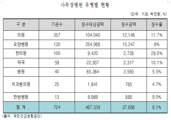 요양기관 종별 기관수는 의원이 357곳으로 가장 많았지만, 징수대상금액은 요양병원이 2540억원으로 절반이 넘었다.