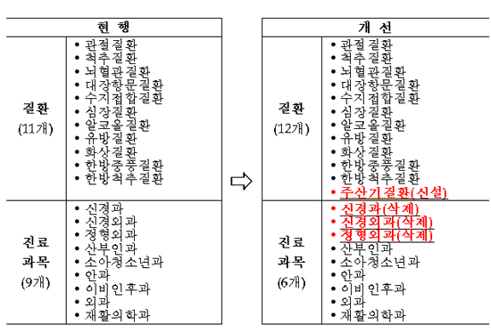가령 질환(11개)과 진료과목(9개)별로 지정돼 중첩된 분야를 질환중심으로 개선해 진료과 중 신경과·신경외과·정형외과는 지정분야에서 제외하고, 관절·척추·뇌혈관 질환으로 통합한다.
