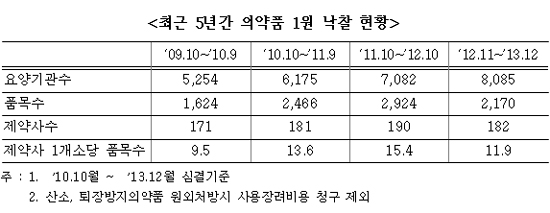 김 의원이 심평원으로부터 제출받은 '의약품 1원 낙찰현황'을 보면 2010년 5254개였던 1원 낙찰 요양기관은 2013년에는 8025개로 증가했다. 같은 기간 1원 낙찰 의약품 수도 1624개에서 2170개로 늘었다.
