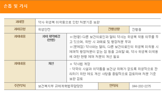 정부가 위생복( 가운)을 착용하지 않은 약사에게 행정처분을 부과하는 현행 약사법령을 '손톱 밑 가시' 규제로 채택했다.