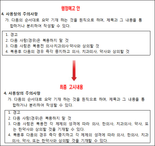 당초 식약처 행정예고안을 보면 ▲1. 경고 ▲2. 다음 사람(경우)은 복용하지 말 것 ▲3. 다음 사람은 복용전 의사·치과의사·약사와 상의할 것 ▲4. 복용후 다음의 경우 즉각 중지하고 의사·치과의사·약사와 상의할 것이라고 돼 있었다.