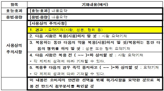 주요 사항은 일반약 요약기재 도입, 사용상 주의사항 외 안전사용 방법 표시 등이다.