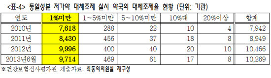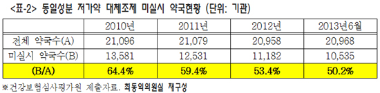대체조제율은 2010년 0.063%, 2011년 0.085%, 2012년 0.083%로 매년 0.1%를 넘지 못하고 있다. 연간 재정절감액도 가장 많은 연도조차 3억4407만원에 그쳤다.