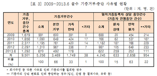 골수기증등록자 절반 이상이 실제 골수기증을 하지 않는 것으로 드러났다. 포기사유는 본인거부와 가족의 반대가 대부분이었다. 심지어 복지부는 연락이 닿지 않는 골수기증자조차 제대로 관리하지 못하고 있는 것으로 확인됐다.