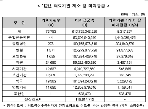 24일 복지부에 따르면 지난해 정부와 지자체는 전체 7만3793개 요양기관에 총 6137억원의 의료급여비를 지급하지 않았다. 기관당 831만원 꼴이다.