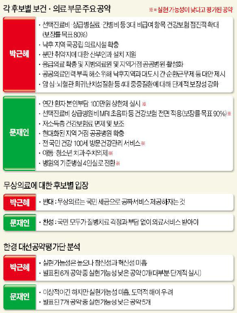 박 후보와 문 후보 모두 보장성 강화와 환자 부담 경감을 약속했지만, 박 후보는 환자 소득수준에 따라 부담과 혜택의 차이를 두고 주요질환의 국가보장에 집중하겠다는 계획이고, 문 후보는 환자의 소득수준과 질병 종류에 무관하게 혜택을 받아야 한다는 입장으로 차이를 보인다.