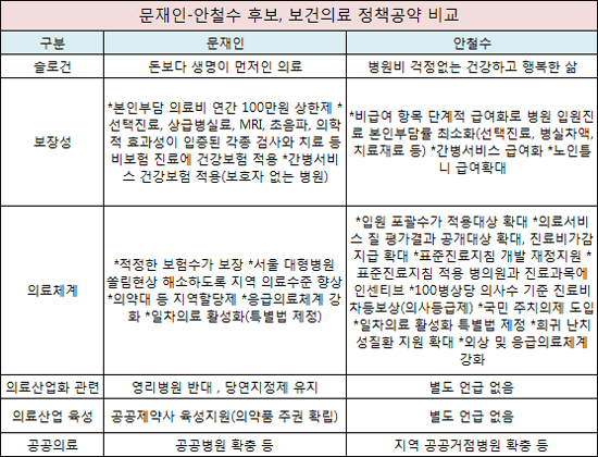 또 안 후보는 주치의제 도입을 구체적으로 적시했고, 문 후보는 동네의원 활성화를 통한 실질적인 주치의화를 모색하겠다고 밝혔다. 외상과 응급의료체계를 강화하는 부분도 양쪽 모두 무게를 뒀다.