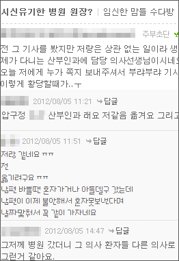 특히 여성회원 175만여 명을 보유하고 있는 임신, 육아 온라인 M카페에서는 김씨로부터 진료를 받거나 H병원에서 출산 혹은 출산준비를 하고 있다는 회원들이 병원이나 의사를 바꾸고 싶다는 글을 올리고 있다.
