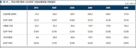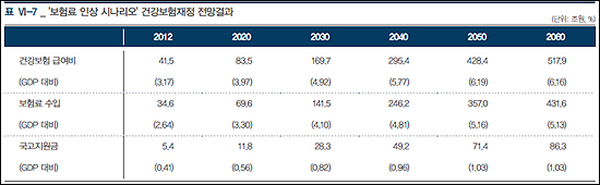 먼저 국고지원율을 현 상태로 고정시키고 보험료만 인상하는 시나리오 전망결과, 보험료 수입은 2012년 GDP 대비 2.6%에서 2060년 5.1%로 빠르게 성장했다.