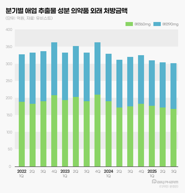 애엽 추출물 60mg의 3분기 처방시장 규모는 163억원으로 전년동기대비 7.8% 줄었다. 애엽 90mg은 작년 3분기 144억원에서 올해 3분기에는 139억원으로 3.1% 줄었다.