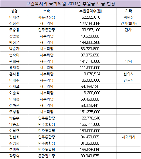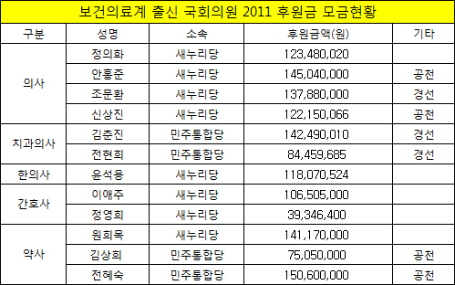의사출신 새누리당 정의화 의원(1억2348만원), 의사출신 새누리당 조문환 의원(1억3788만원), 의사출신 새누리당 신상진 의원(1억2215만원), 한의사 출신 새누리당 윤석용 의원(1억1807만원), 간호사 출신 새누리당 이애주 의원(1억650만원) 등도 1억원 이상 모금했다.