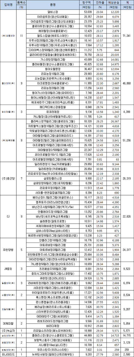한독약품은 9개 512억원의 손실이 예상됐지만, 사노피 품목이 포함돼 있는 점이 고려돼야 한다.